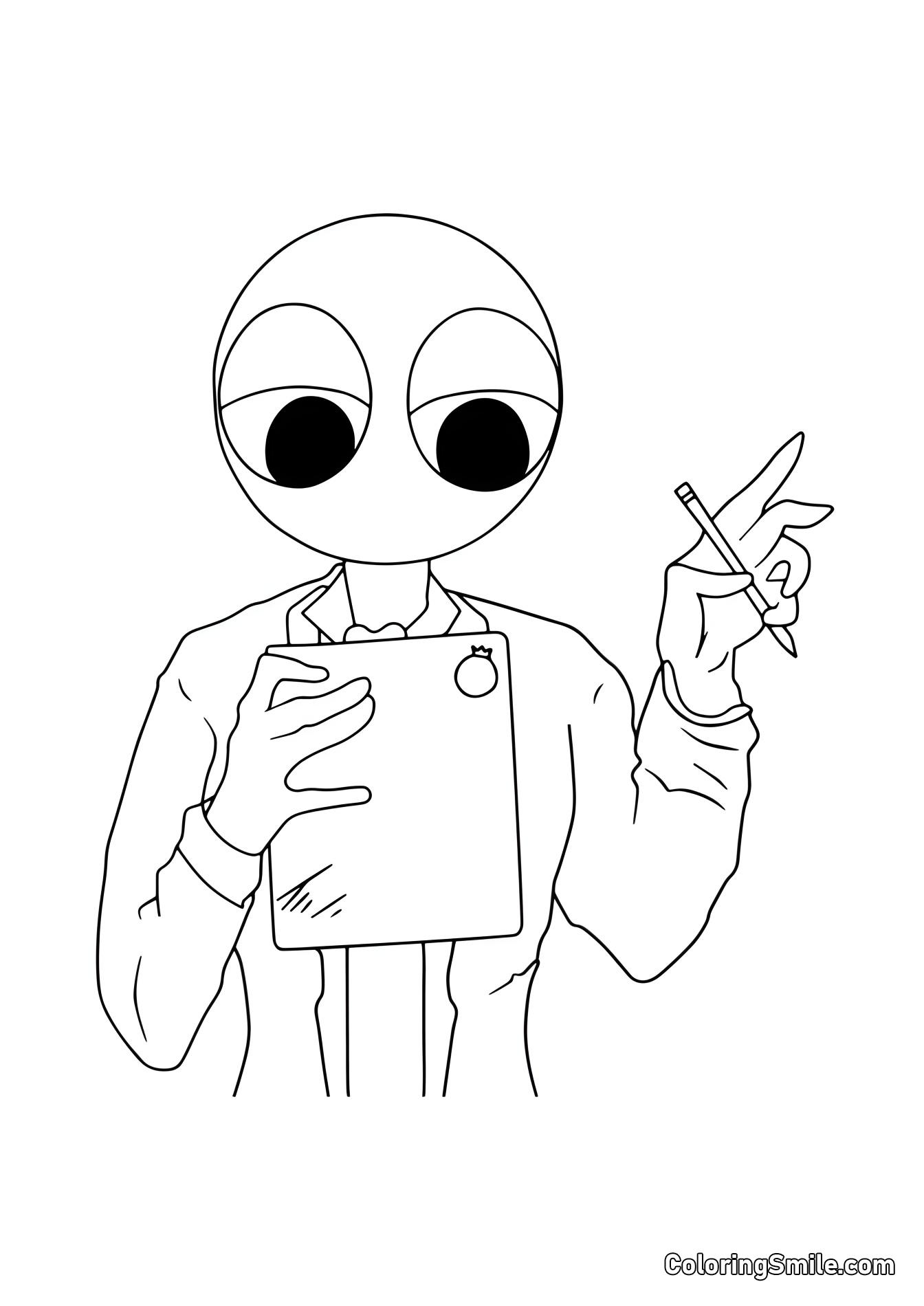 - Rot: Ein skurriler Charakter mit einem großen Kopf, gekleidet in einem weißen Laborkittel über einem Anzug.